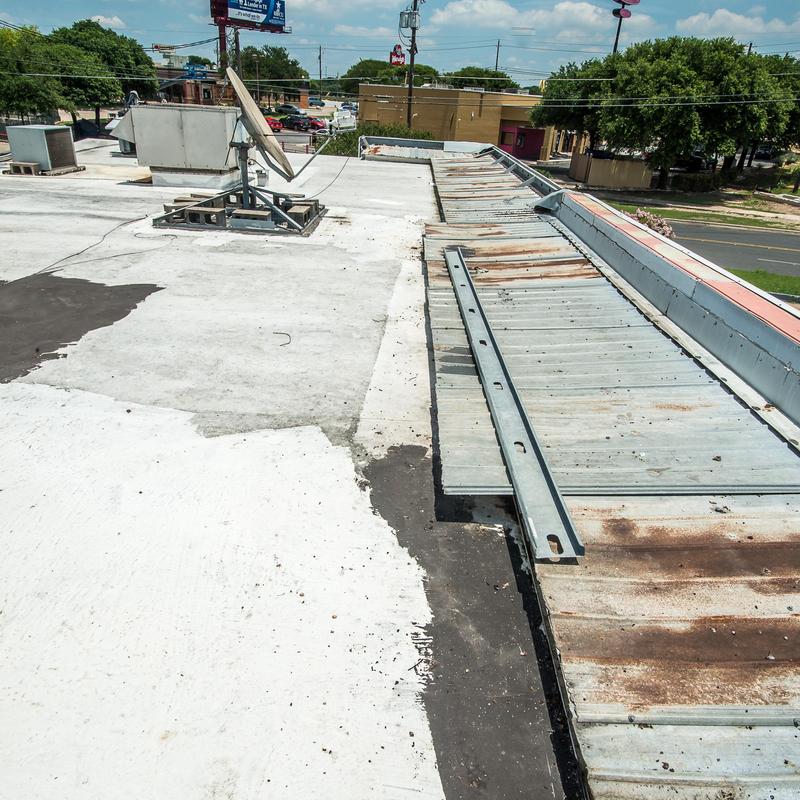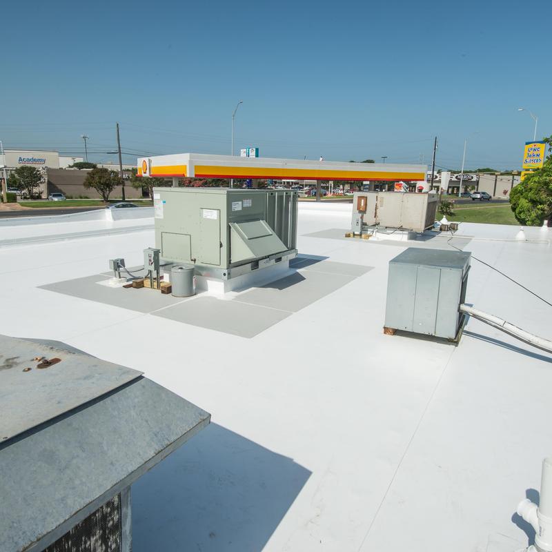 Bluebonnet Roof Co completed a commercial roof replacement in Austin, Texas. The team removed an old TPO membrane roof, installed new decking, TPO material, drip edge, and curb flashing for HVAC units, and replaced the original metal fascia on a Shell Station.