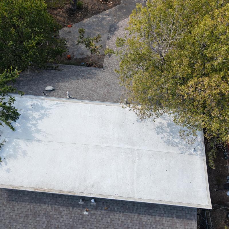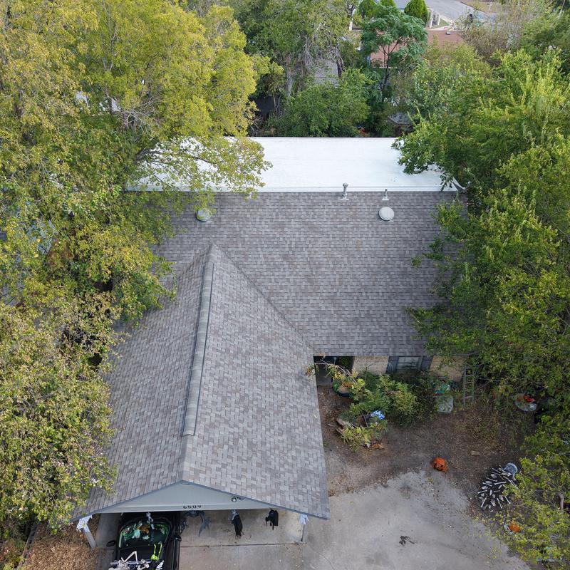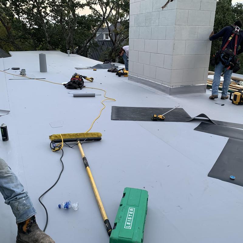 Bluebonnet Roof Co removed a 3-tab shingle roof and installed CertainTeed Landmark HD shingles in Austin, Texas. The crew replaced a modified bitumen flat roof with a GAF TPO membrane and insulation boards. TPO-coated metal transition pieces connected the flat and sloped roof sections for a reliable seal.