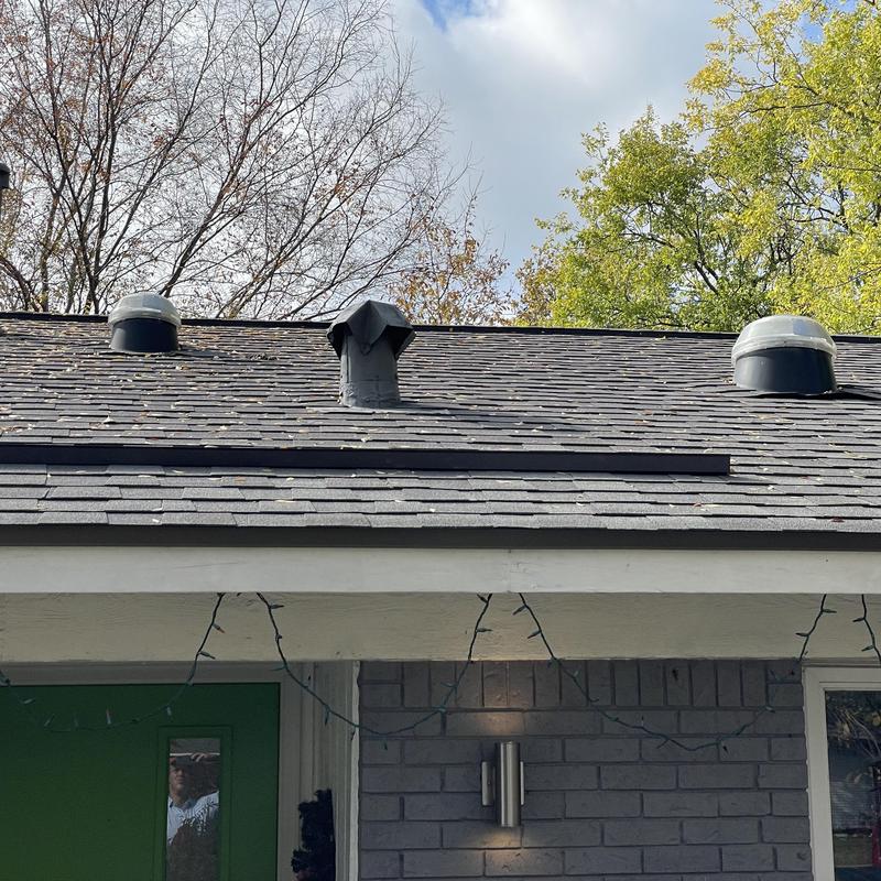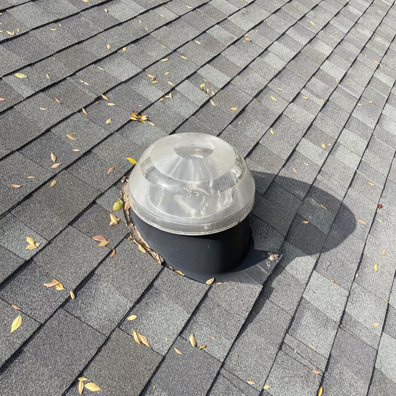 Bluebonnet Roof Co replaced a damaged shingle roof after a hail storm in Austin, Texas. The team also removed and reset a sun tube, also known as a sky tunnel, to maintain natural interior lighting.