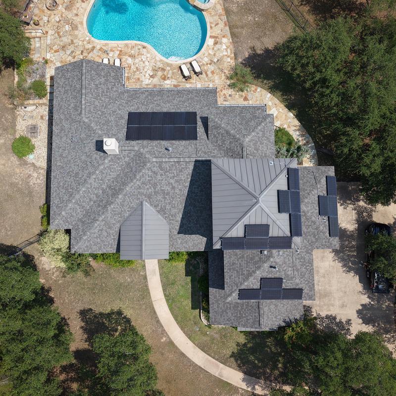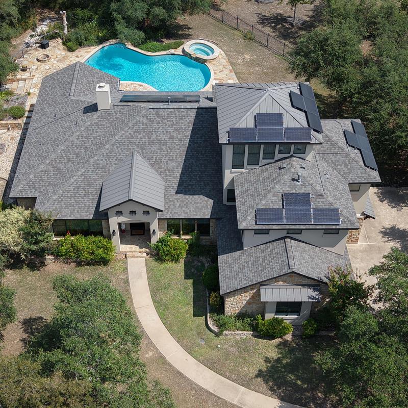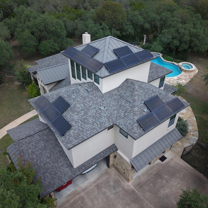 Bluebonnet Roof Co completed a hail damage roof replacement in Austin, TX. The crew removed old architectural shingles and installed new CertainTeed Landmark shingles. They also repaired a standing seam metal roof and handled the removal and reinstallation of solar panels.