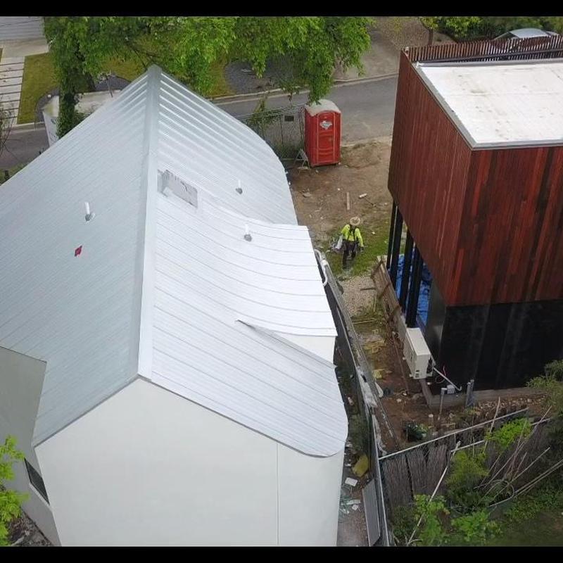 Bluebonnet Roof Co installed a standing seam metal roof in Austin, Texas. The project included high-temperature underlayment, an ice and water shielding membrane, and a Velux skylight with flashing kits.
