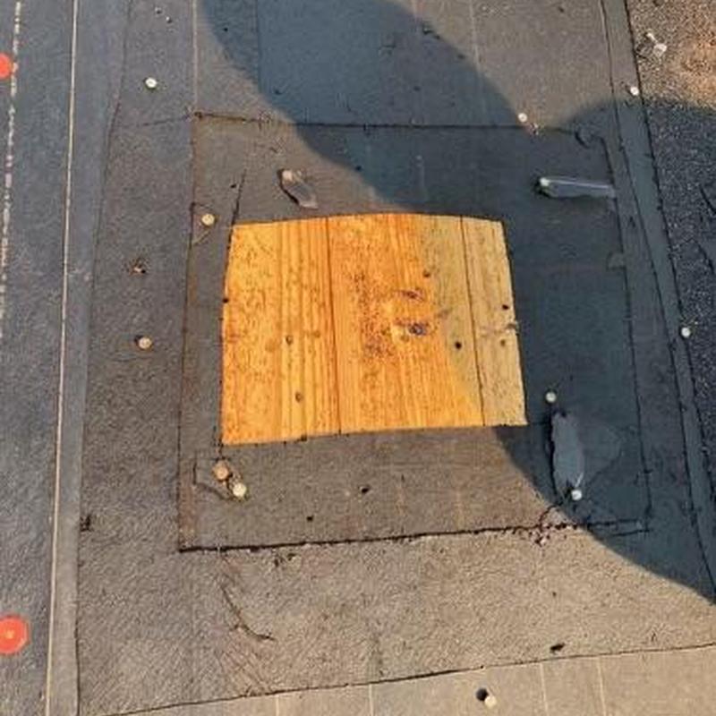 Bluebonnet Roof Co repaired roof damage in Bee Cave, Texas, caused by a fallen tree limb. The team removed broken shingles, applied a metal flashing plate, and installed new shingles to seal the opening. This repair avoided a full decking replacement by covering the small puncture with steel flashing.